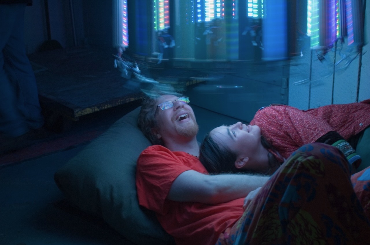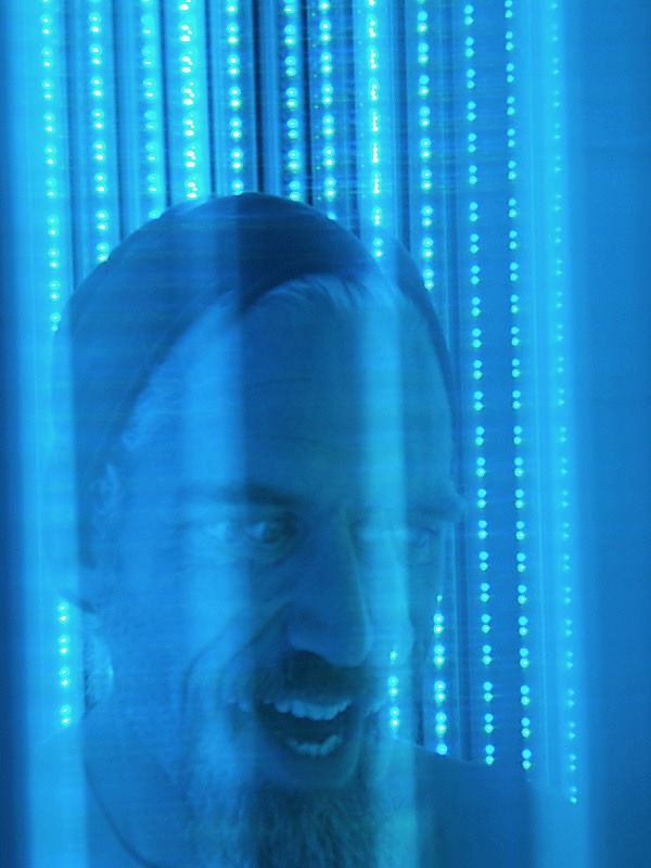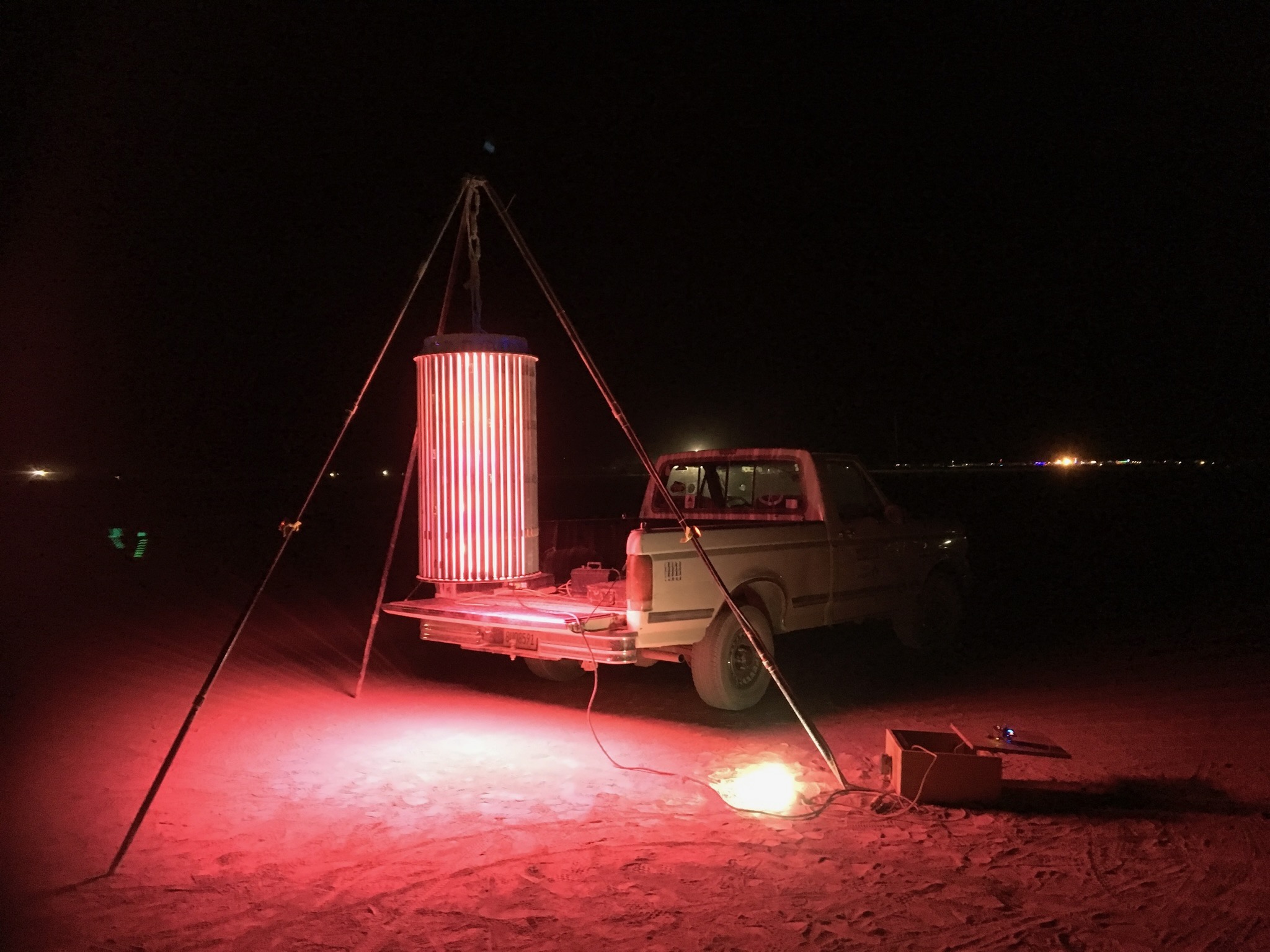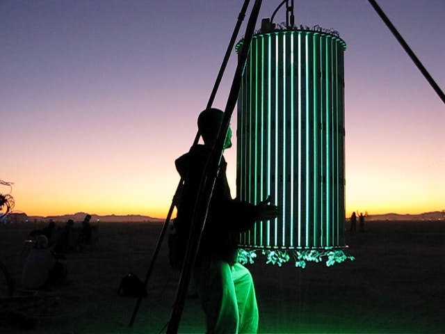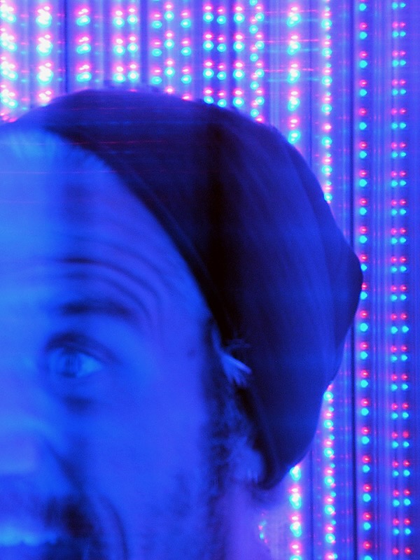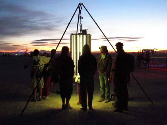 The percipient stands within the cylinder, and it rotates around them while the LEDs are driven with generative, algorithmic patterns, inducing a vertical ascension, varied shapes and patterns, and in some cases, a transcendent Experiencean accompanied by indescribable hypnagogic hallucination, like awakening from a beautiful dream. It has been exhibited at events across the US and internationally. The piece is also known as the Convulsatorium.