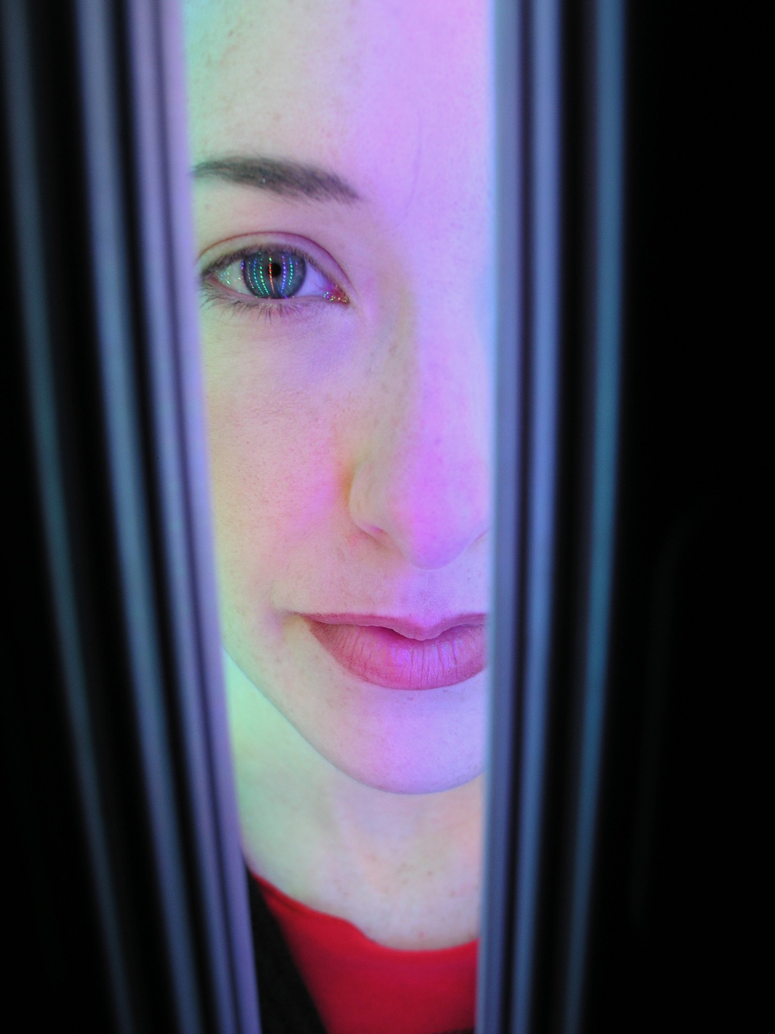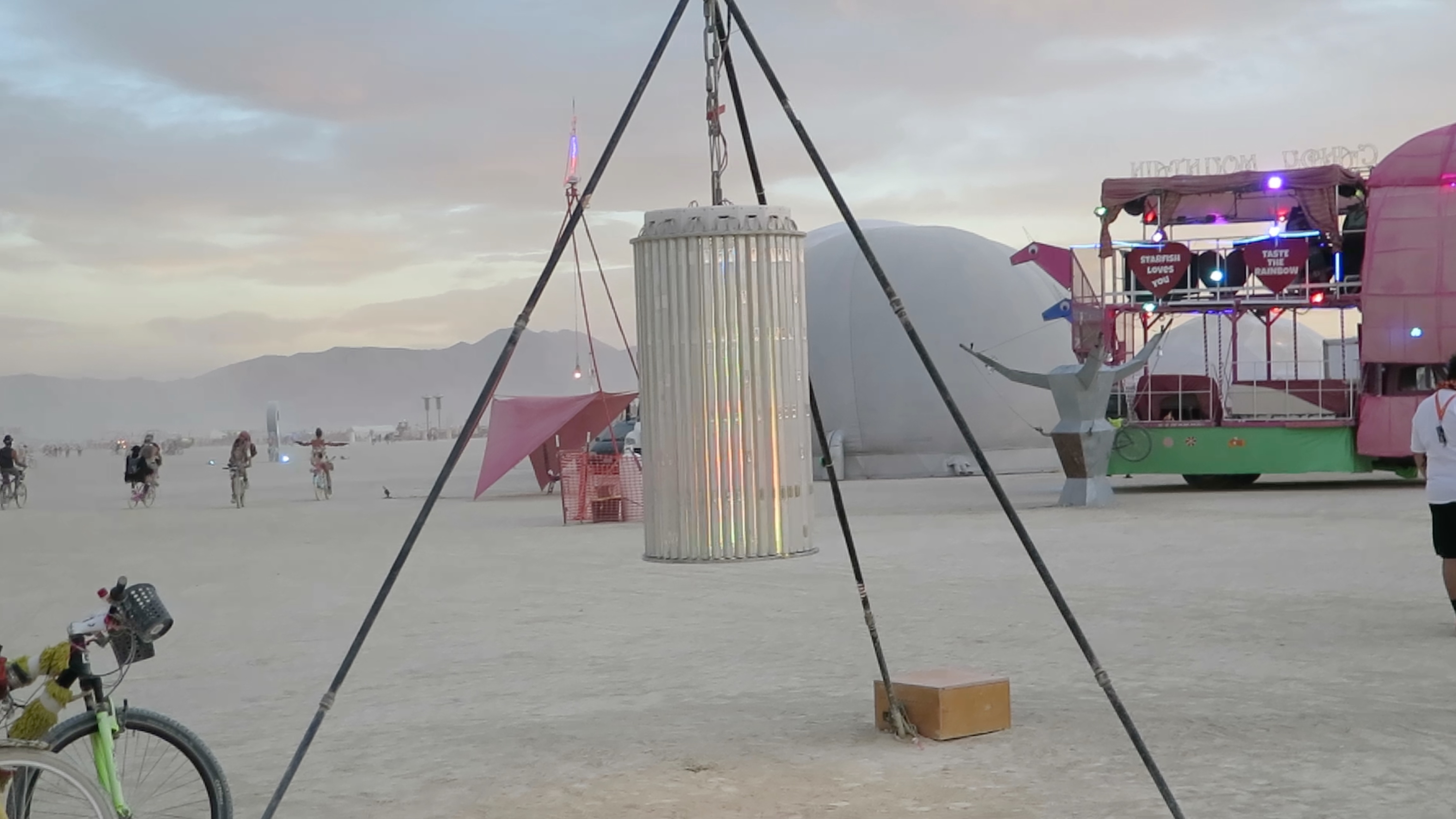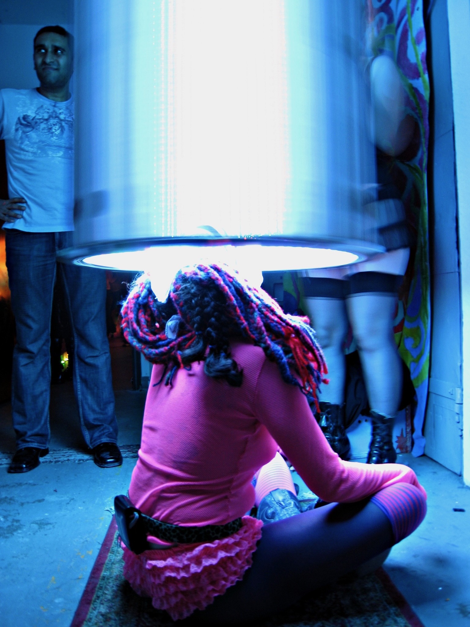 The percipient stands within the cylinder, and it rotates around them while the LEDs are driven with generative, algorithmic patterns, inducing a vertical ascension, varied shapes and patterns, and in some cases, a transcendent Experiencean accompanied by indescribable hypnagogic hallucination, like awakening from a beautiful dream. It has been exhibited at events across the US and internationally. The piece is also known as the Convulsatorium.